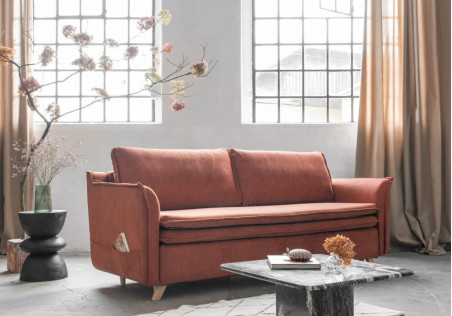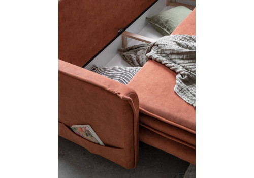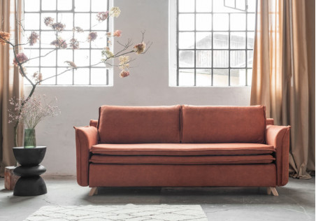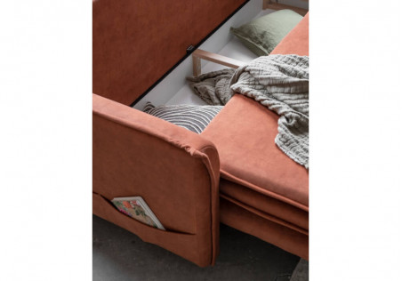 Our truly boho-style sofa bed is slim and light thanks to the use of high feet. The innovative use of a surface mattress, which is an integral part of the sofa, ensures high sleeping comfort. Perfectly balanced armrests, bed storage box, comfortable double seat finished with an original trim, side pocket for accessories makes a sofa truly outstanding one.