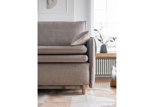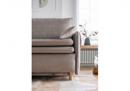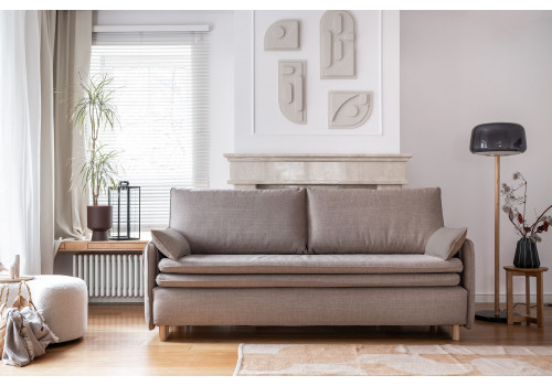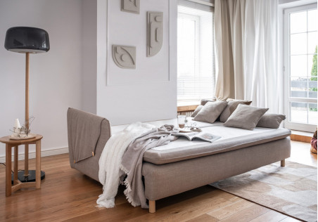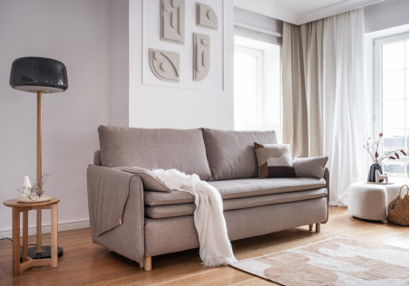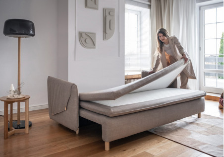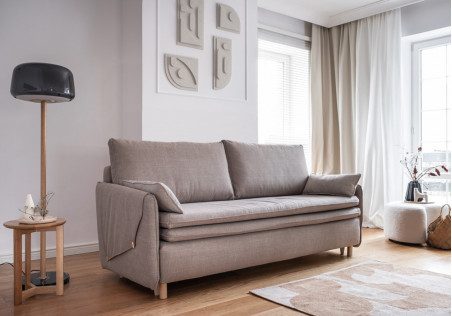 Our sofa bed with folding maress gains even more slenderness and lightness thanks to the use of tall, oval feet. The innovative surface mattress, which is an integral part of the sofa, ensures high comfort of sleeping. Main features: narrow armrests covered by an addittional fabric with decorative butons, a box for bedding, a comfortable seat with an original trim.